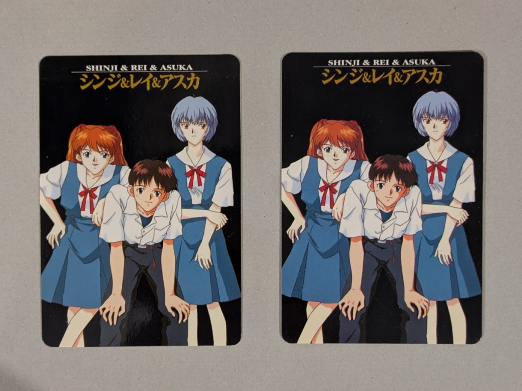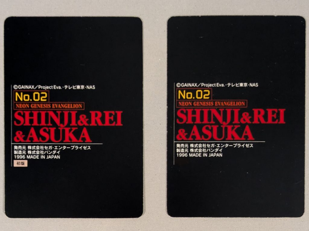Et même si c’est uniquement le classeur qui m’intéressait, il était vendu avec une soixantaine de Carddass Evangelion que je possédais déjà. Une fois ce classeur en main, je retire toutes les cartes présentes afin d’y mettre les miennes et me rends compte que les cartes du classeur sont dans un état exceptionnel, peut-être meilleur que celui de mes Carddass. Je décide donc, une à une, de comparer les deux exemplaires de chacune des cartes que j’ai en double. Et en m’attardant sur les dos de deux de ces cartes, quel ne fut pas mon étonnement. Sur ces deux cartes par exemple, rien ne semble indiquer la moindre différence au vu du recto :